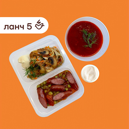Ланч №5:Суп борщ со сметаной/рагу с горошком и охотничьими колбасками/салат блинный