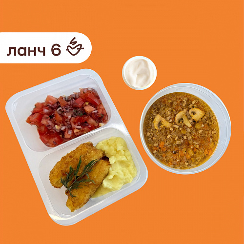 Ланч №6:Грибная похлебка со сметаной /сальса из помидор/треска темпура с пюре