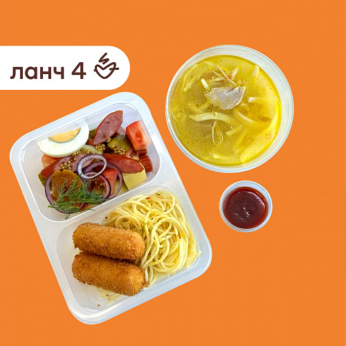 Ланч №4:Суп лапша домашняя/спагетти с сосисками фри и соусом барбекю/салат охотничий