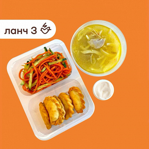 Ланч №3:Лапша домашняя со сметаной/вареники фри с соленым творогом/корейская морковь с огурцом