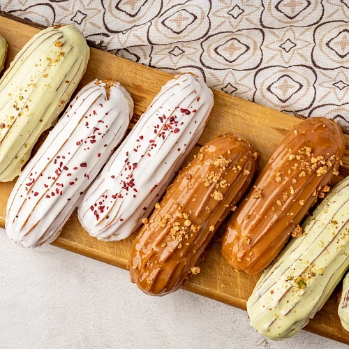 - заварные эклеры с шоколадно-сливочным, сырно-творожным, фисташковым кремом;